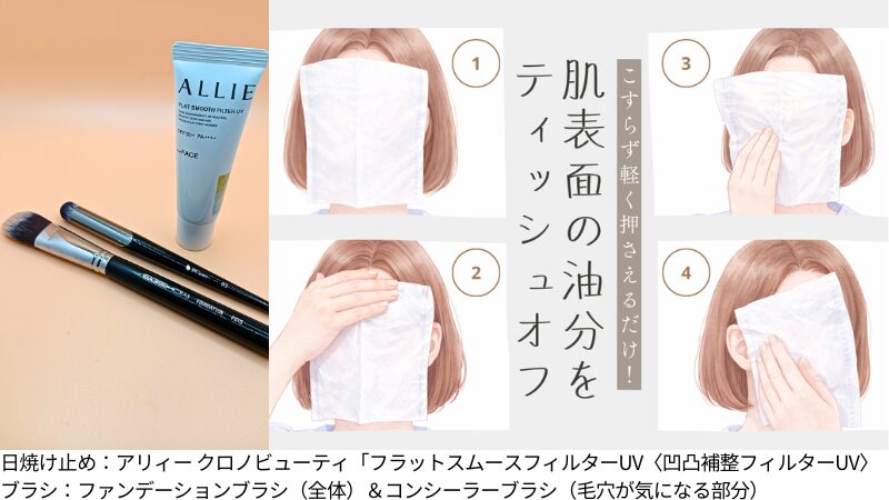 日焼け止めを塗った後に肌表面に残ったスキンケアの油分をティッシュで軽く押さえます。これだけでベースメイクの密着力とキープ力が変わります