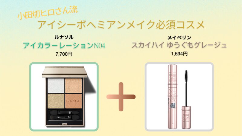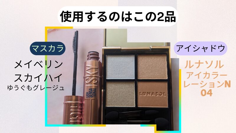 アイメイク編でご紹介するのは、ルナソル「アイカラーレーションN04」と、メイベリン「スカイハイ ゆうぐもグレージュ」の2品です。